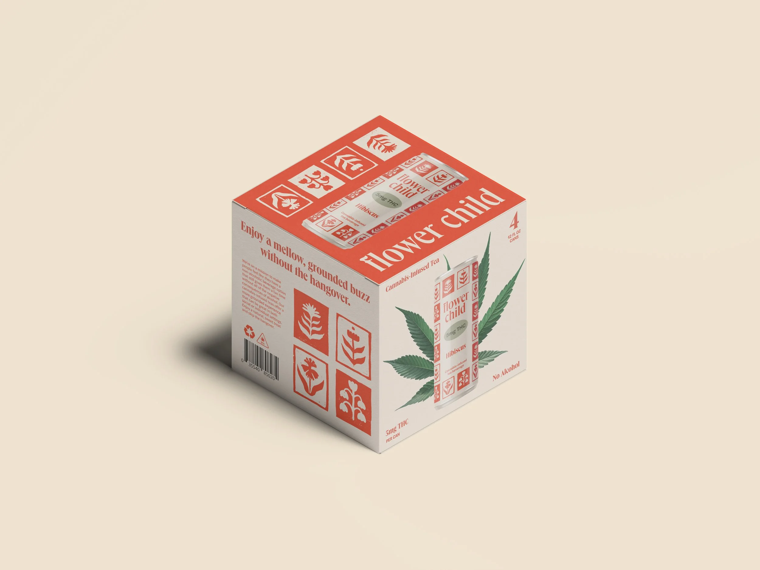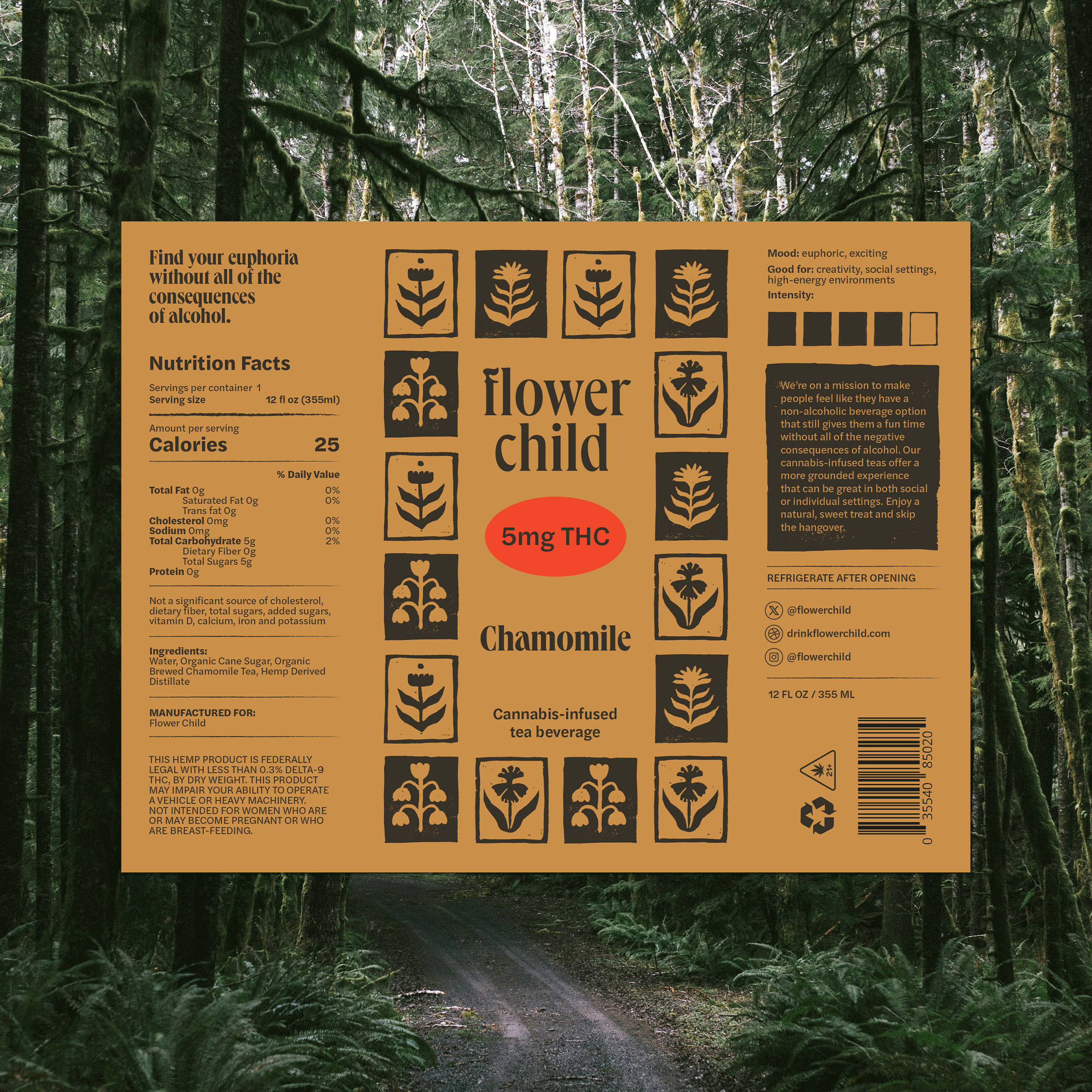 The creative solution was to focus on a “granola” audience — one that enjoys being in nature and feeling grounded over going out and drinking alcohol. The earthy colors, tea-based flavors, and floral elements target the outdoorsy demographic, while conveying the more mindful and chilled-out buzz you get from Flower Child THC beverages.