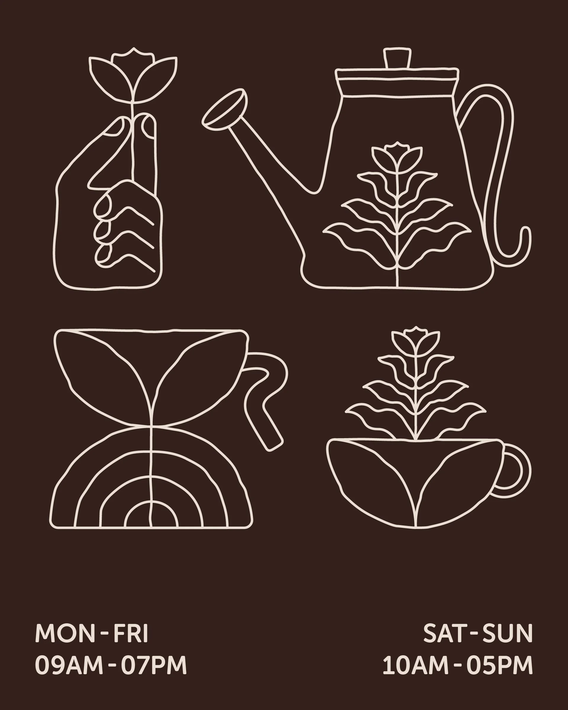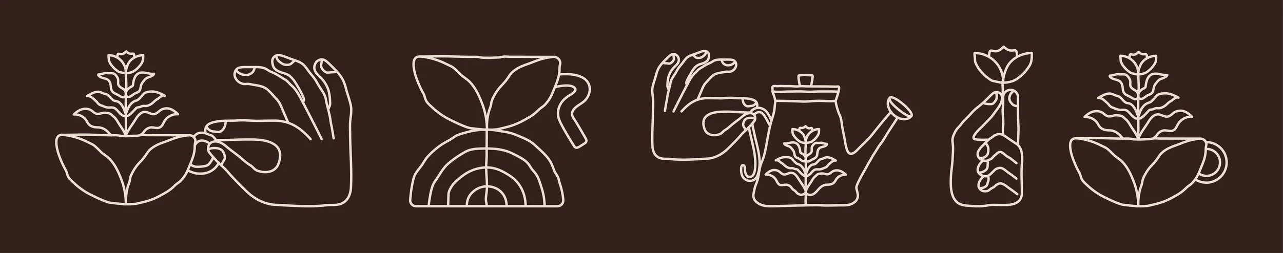 The garden imagery is at the core of the visual identity, from lush, green imagery to illustrations of plants growing from coffee cups like the roof of the café. The details are woven into each drawing carefully: the tea kettle imitates a watering can and the moka pot has geometric “roots” and “flower petals.”