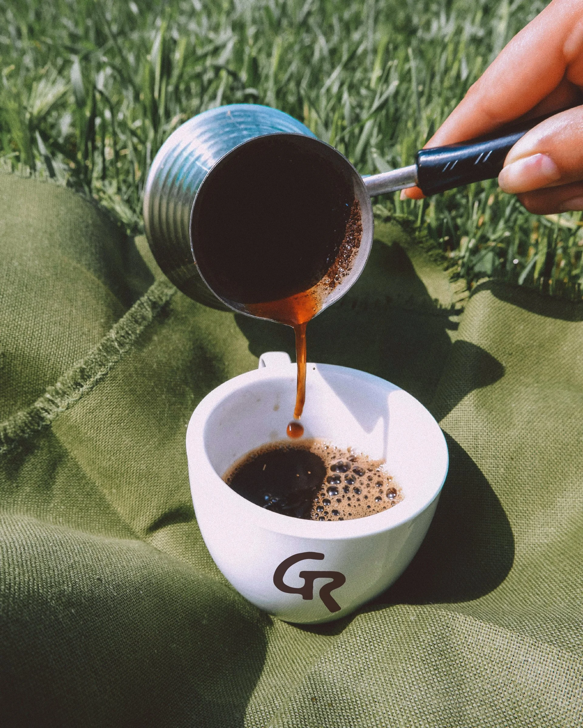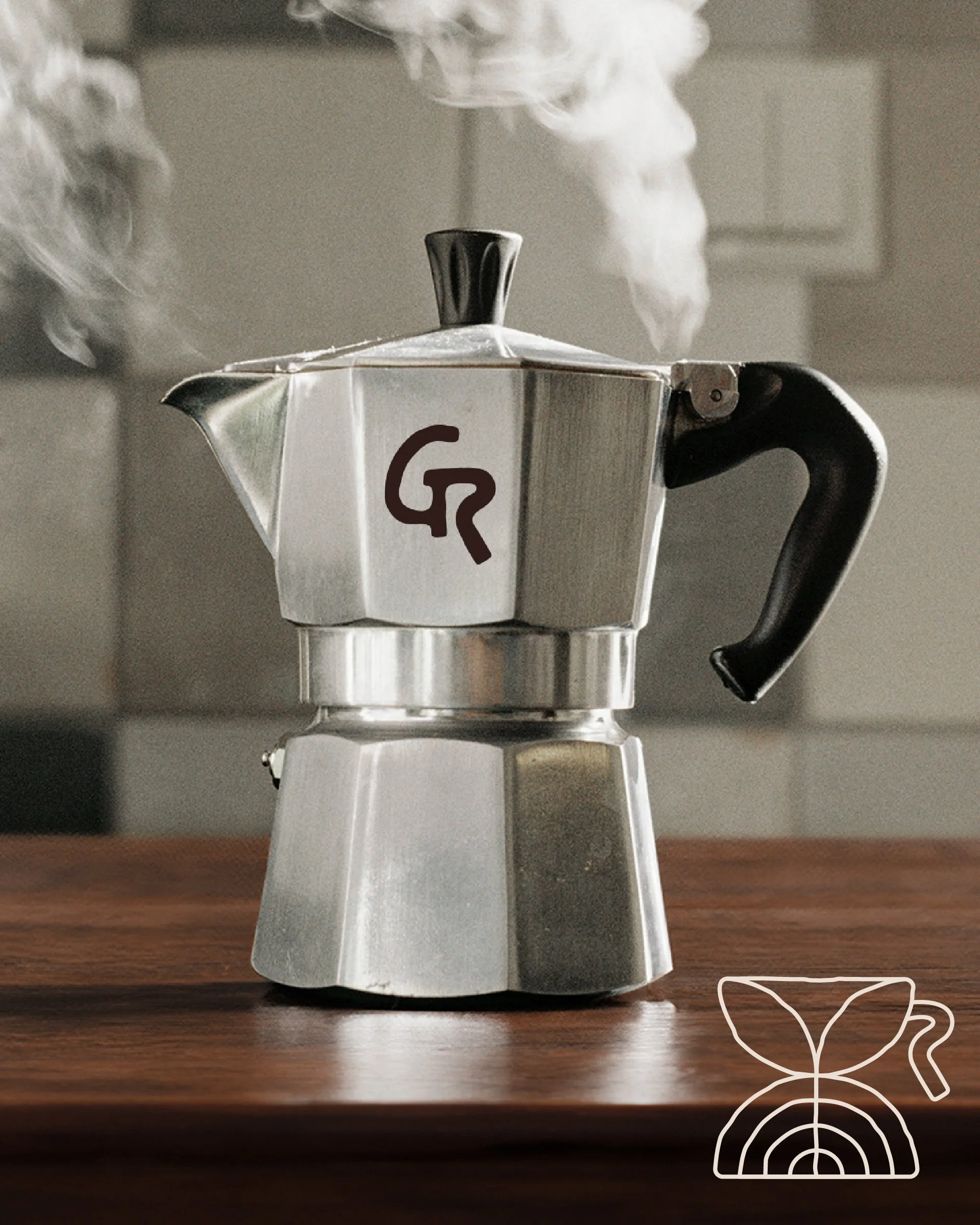 The “GR” logo nods to the design of a coffee cup or moka pot, with the counter and leg of the “R” resembling a handle. The café utilizes an earthy yet bold two-tone color palette that excludes green to set it apart from other sustainability-focused brands; allowing it to complement the surrounding natural environment.